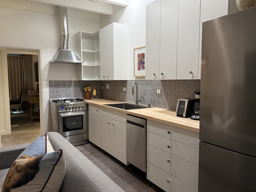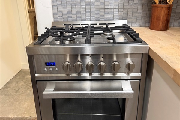 The fully equipped kitchen includes a gas stove and oven, making it easy to prepare anything from a simple breakfast to a full dinner at home.