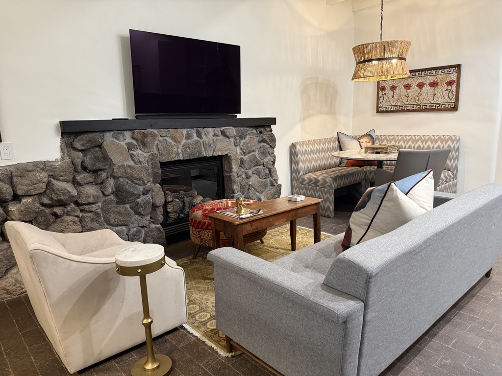 The living area welcomes you with classic Santa Fe touches, including beamed ceilings and a gas fireplace, paired with stylish furnishings and a 65" TV with Sonos sound system—perfect for relaxing after a day exploring the city.